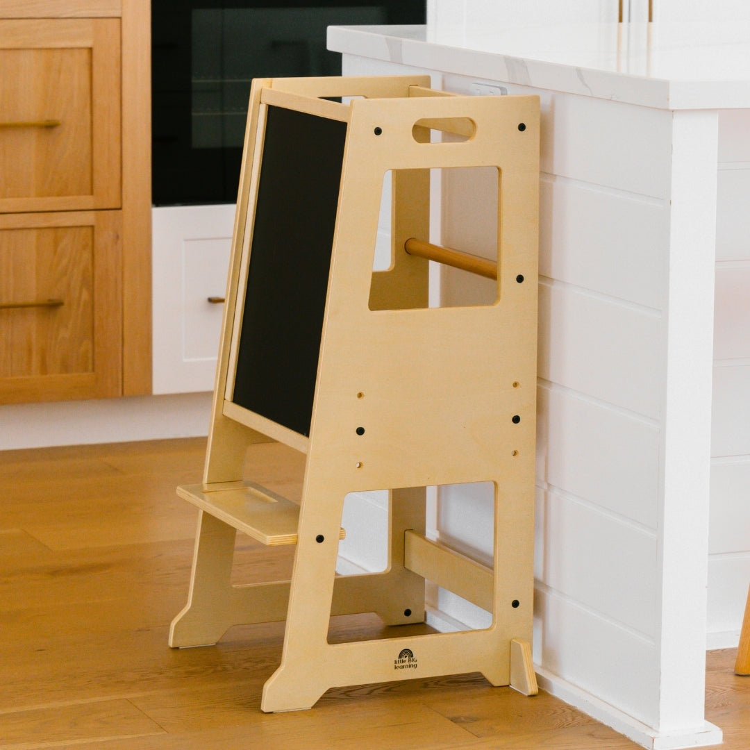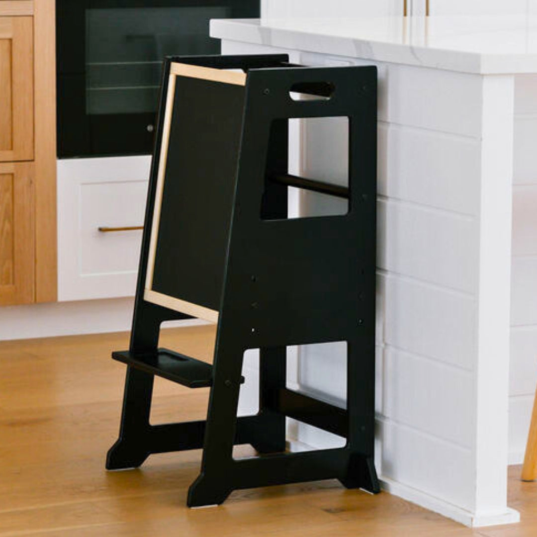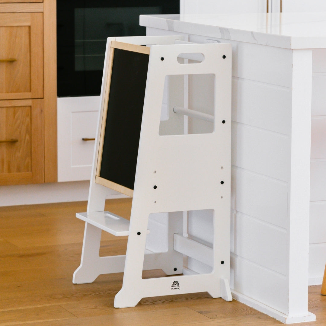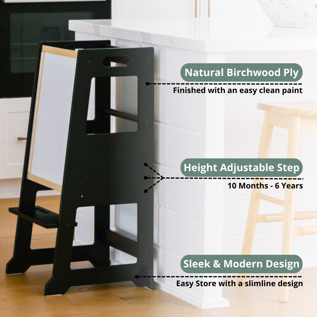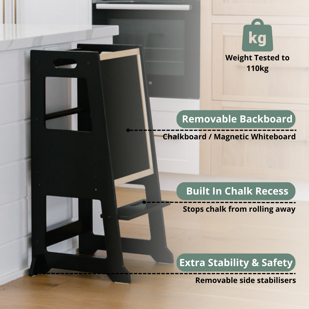 All Towers come with removable chalkboard which doubles as a backing once the Little Big user is safely on the platform and Towers are only to be used against a kitchen or bathroom bench to ensure 4-sided safety.